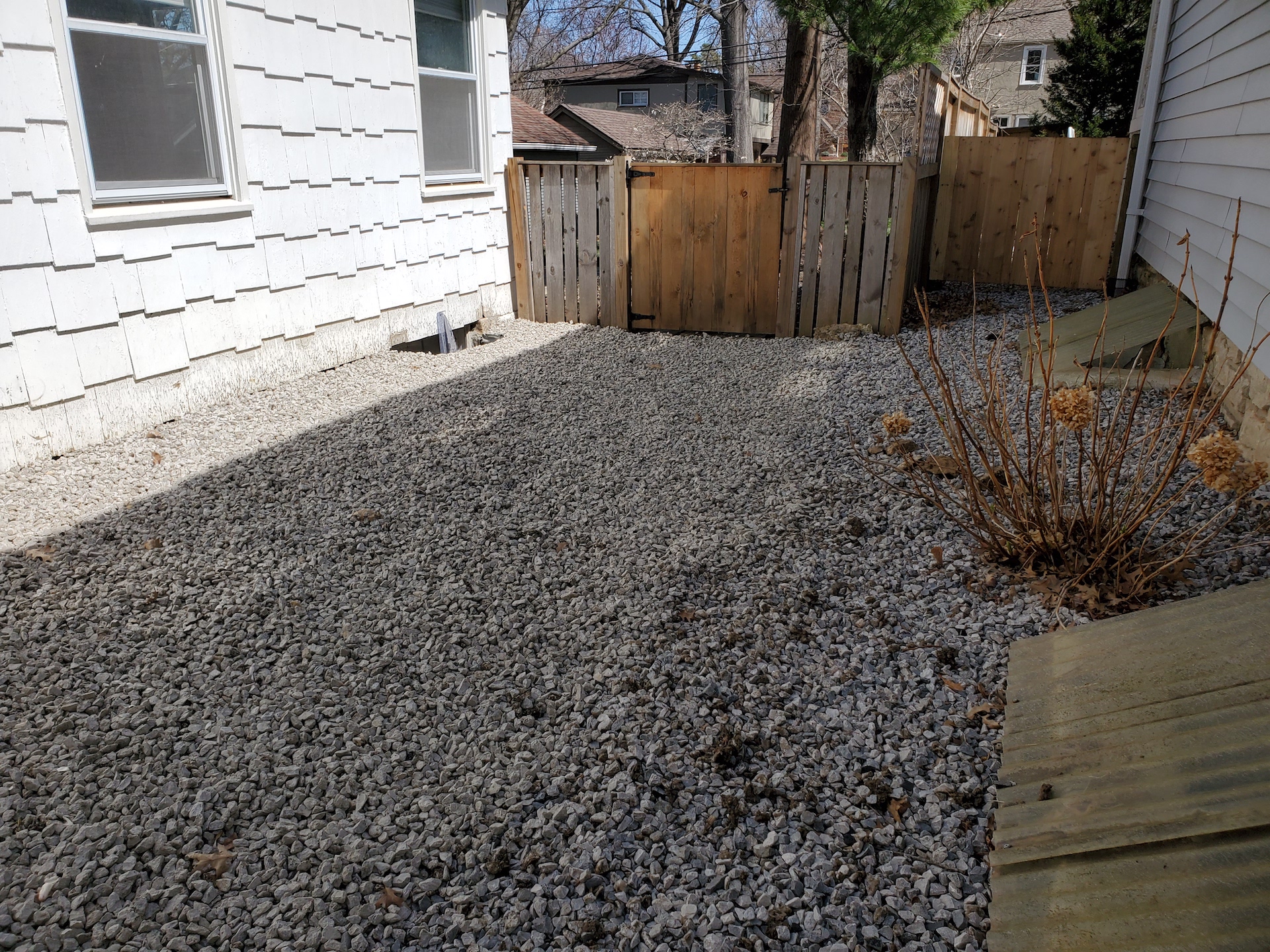 - After the French drain was completed and landscaping rock was spread out.