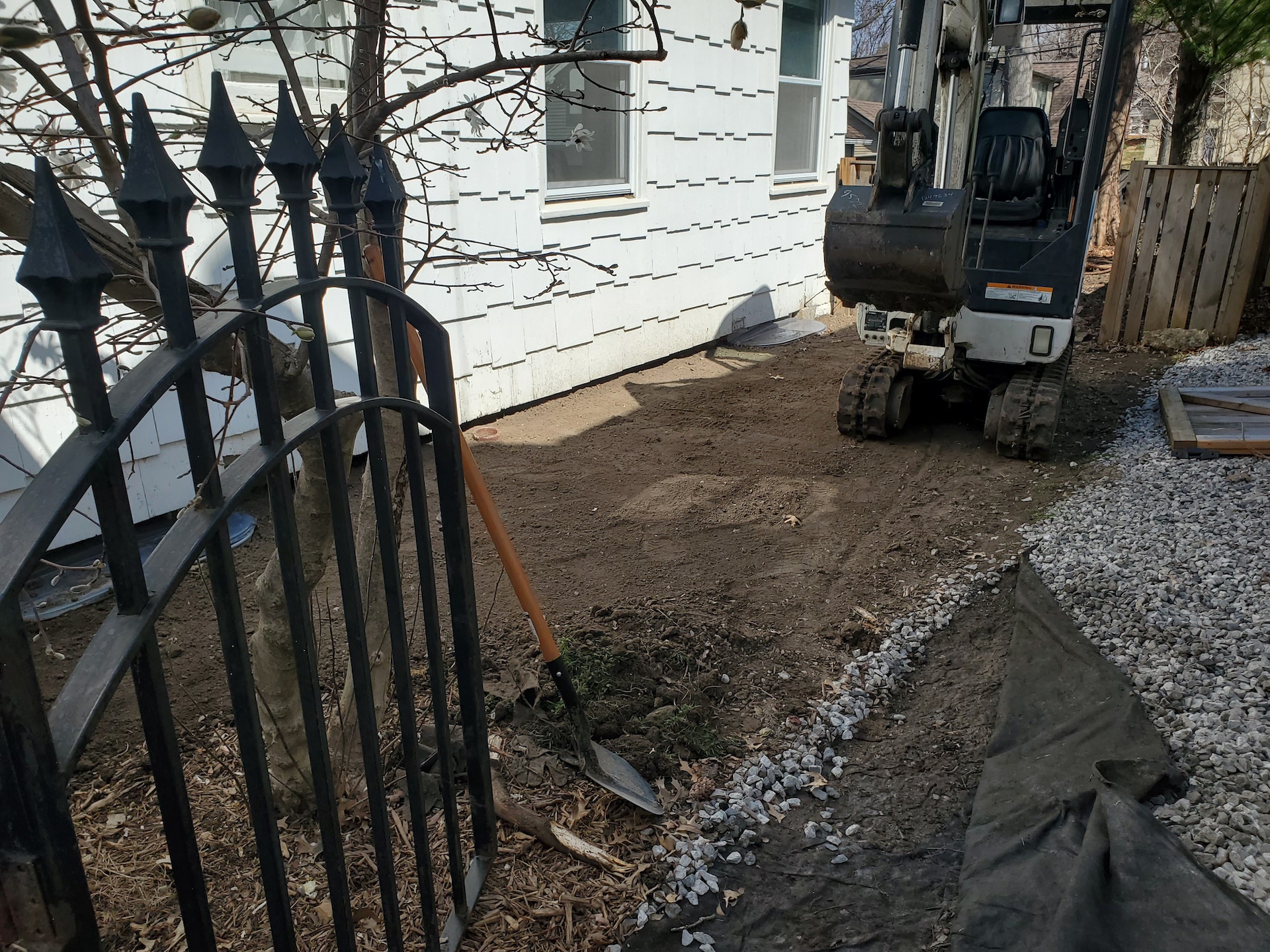 After the French drain was completed and landscaping rock was spread out.